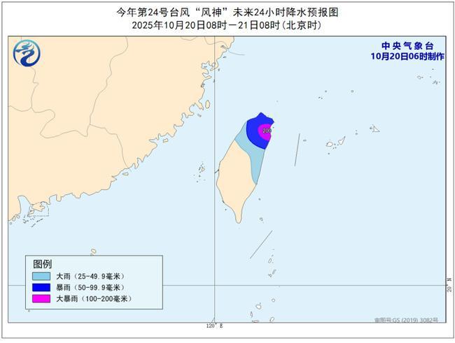 降水预报:20日08时至21日08时,台湾岛北部有大到暴雨,局地有大暴雨(100-200毫米)。