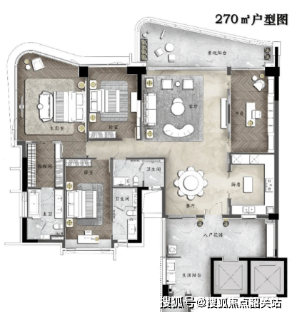 :270㎡环幕江景四房,约 9 米超大邮轮式阳台,一线望江无遮挡,专梯专户设计,配备墅级空中双花园和约 28㎡超大私家庭院,多功能空间丰富,约 42㎡超大主卧空间,270° 环幕江景,阔绰双主套房设计,尽显奢华舒适。