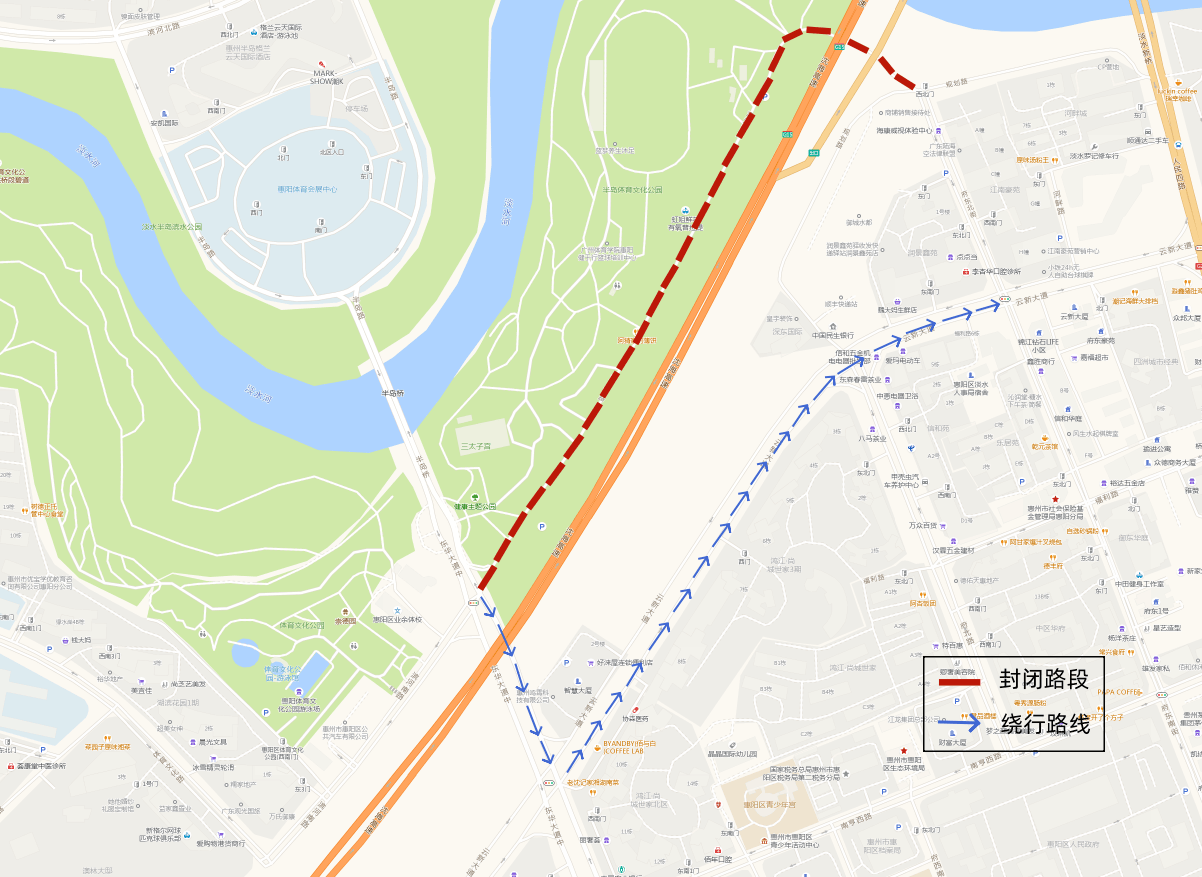 二、交通管制方案对滨河南路部分路段实施封闭管制,禁止机动车、非机动车通行。过往车辆可通过云新大道绕行。(如下图所示)