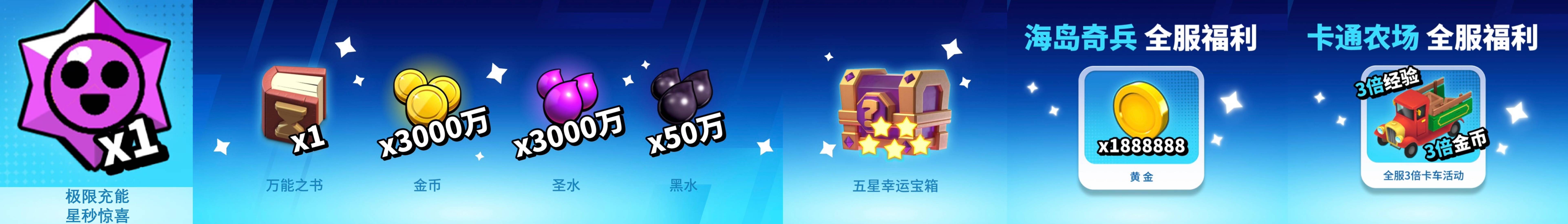 (上图依次为《荒野乱斗》《部落冲突》《皇室战争》《海岛奇兵》《卡通农场》全服福利)