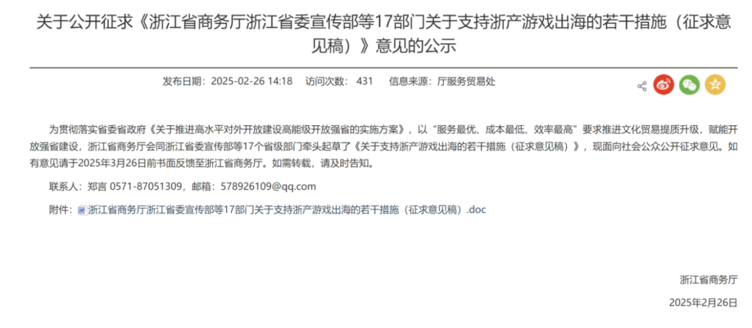 2月26日,浙江省商务厅发布公示:浙江省商务厅会同浙江省委宣传部等17个省级部门牵头起草了《关于支持浙产游戏出海的若干措施(征求意见稿)》(以下简称“《措施》”),现面向社会公众公开征求意见。